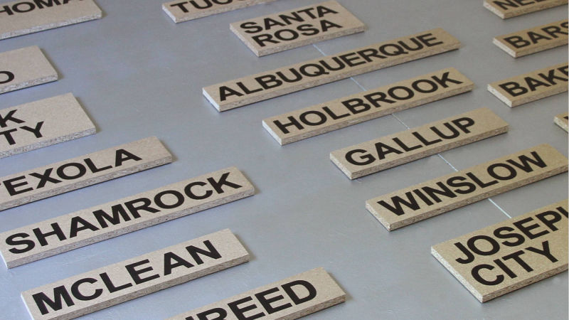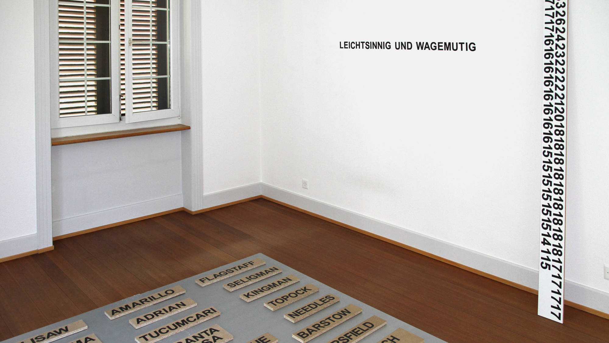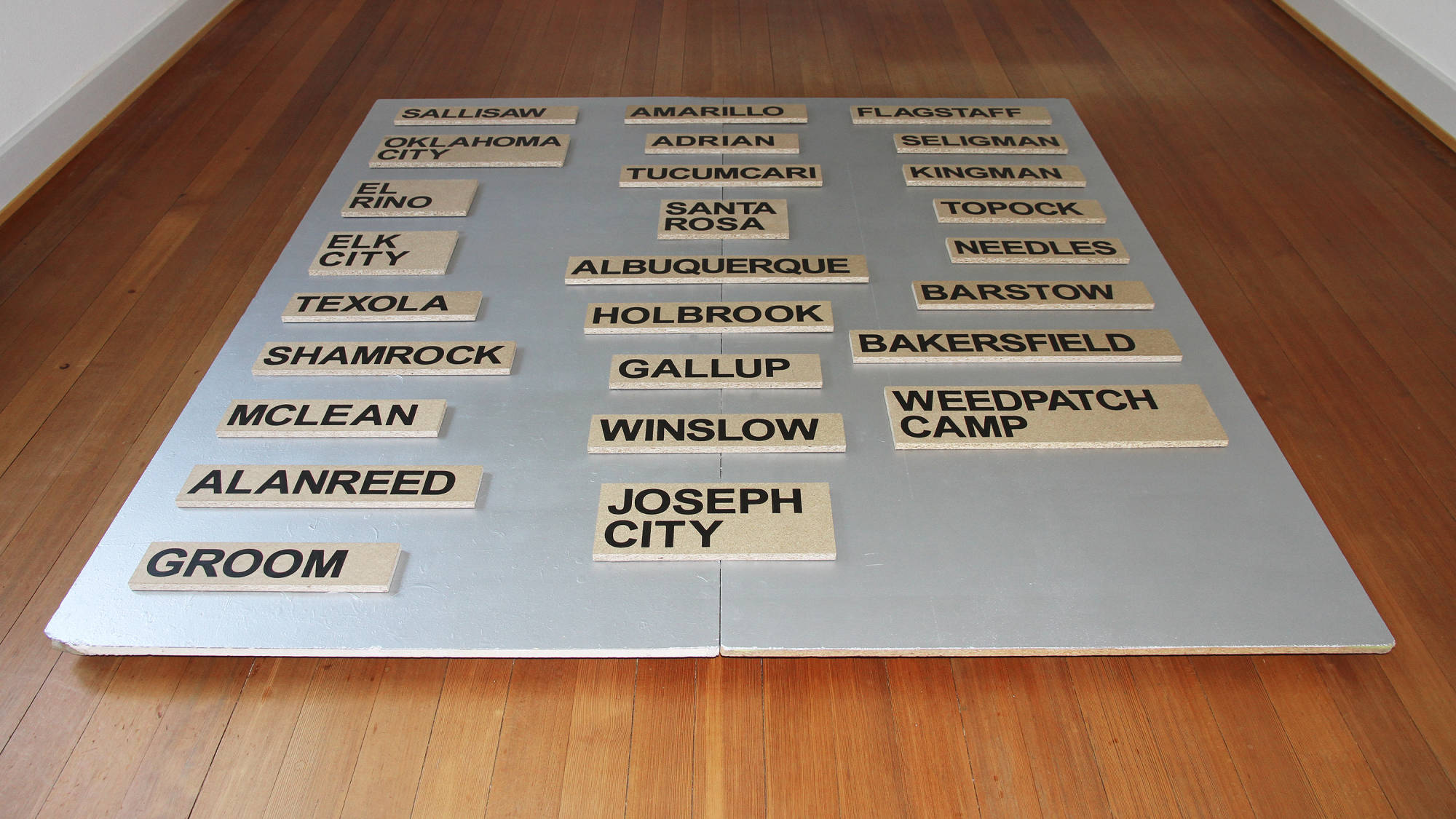 «SHOULD I STAY OR SHOULD I GO» von THE CLASH trifft das Konzept, das meiner Arbeit im Raum zugrunde liegt, am ehesten. Die Frage, soll ich das eine tun und das andere lassen, ist ein kompromissloses Vorgehen. Die Arbeit «JOURNEY OF THE JOAD FAMILY» beschreibt diese Form sehr präzise. Zu bleiben scheint keine Option – die Ortsnamen, entlehnt aus dem Roman von John Steinbeck «THE GRAPES OF WRATH» aus dem Jahr 1939, symbolisieren diese Entscheidungen zu gehen sehr eindringlich. Es ist ein langer Weg. Eine Flucht aus Hunger und Armut in Oklahoma in eine nicht bessere Welt in Kalifornien. Entscheidungen beinhalten die richtige wie auch die falsche Wahl. —