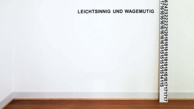ZAHLEN, 2026; Acryl auf Faserplatte; 200 cm / 18 cm / 1,6 cm. LEICHTSINNIG UND WAGEMUTIG, 2026; Acryl auf der Wand; 6 cm / 145 cm.
